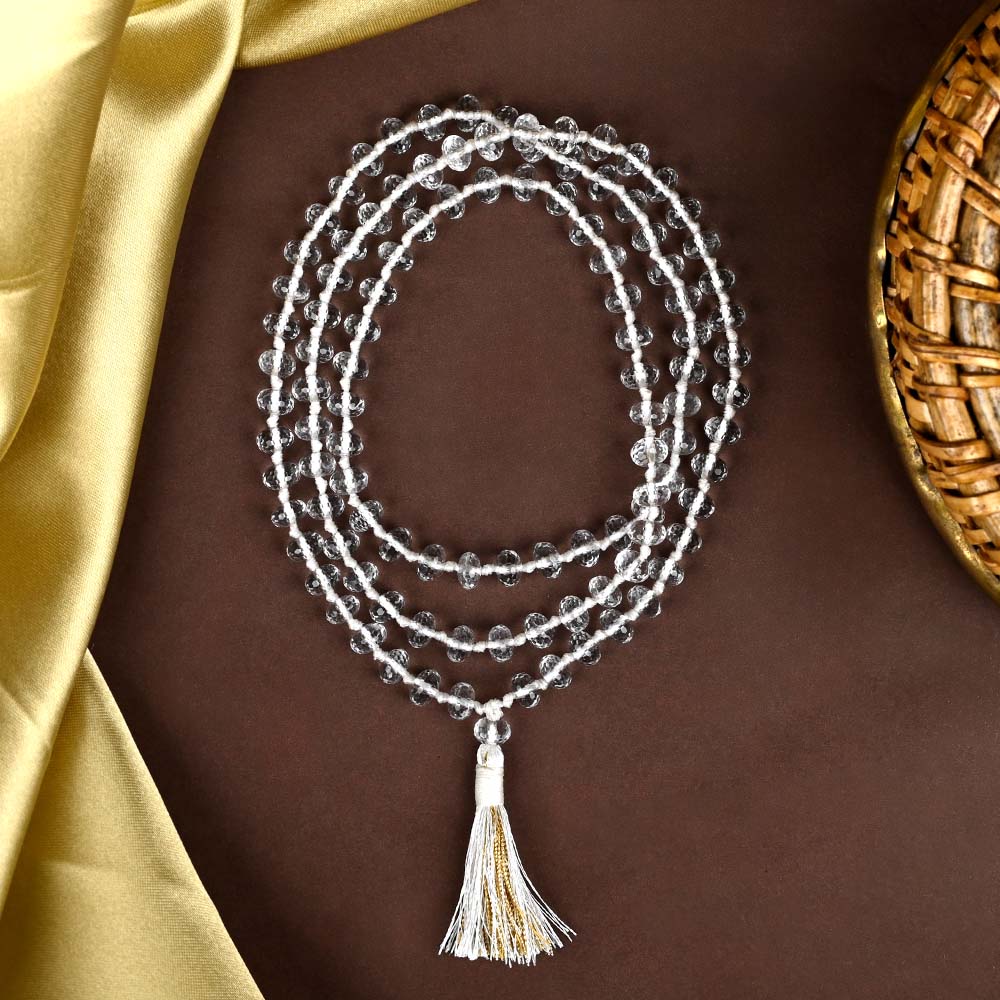 This Sphatik Faceted Elliptical Beads Mala features finely cut natural and flawless crystal quartz beads, each crafted into an elliptical shape with precision facets that beautifully reflect light. The clear, transparent quality of the Sphatik enhances its brilliance, while the hand-knotting between each bead ensures durability and smooth handling during japa or wearing. A white and golden tassel at the end adds a graceful finishing touch.