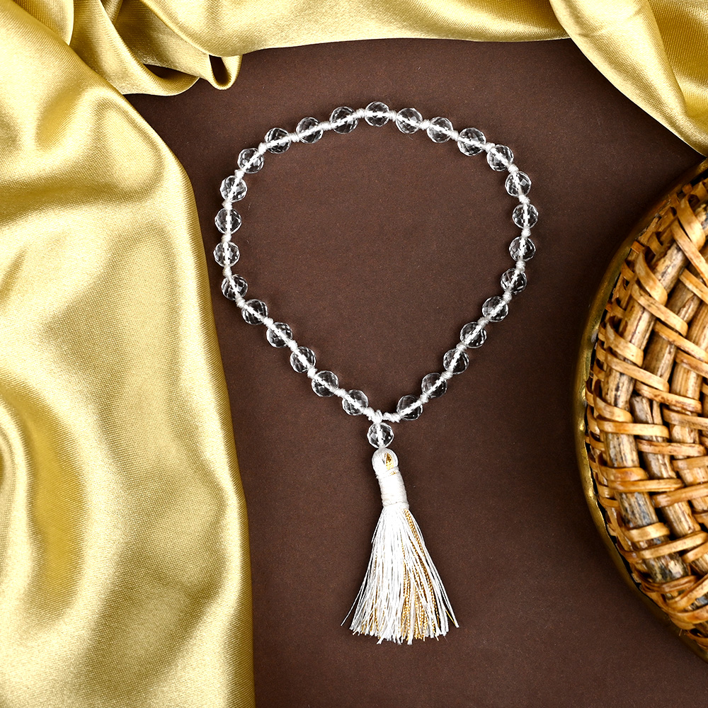 This mala is made with fine faceted premium Sphatik (crystal quartz) beads, each polished to perfection, reflecting light with a radiant glow. The mala features a Sumeru bead, which is traditionally used as a counter in mantra recitation. The design is completed with a delicate white tassel, symbolizing purity and spiritual energy.