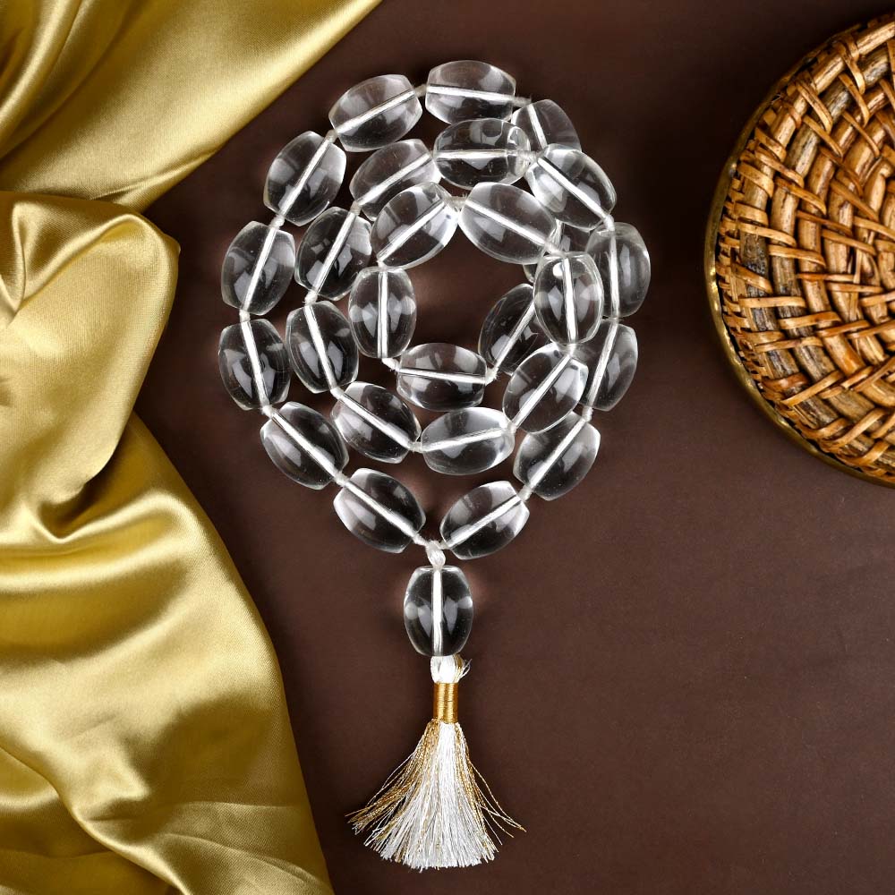 This Sphatik Faceted Twisted Beads Mala is crafted from high-quality, natural crystal quartz beads, each meticulously shaped into an elongated oval form with a smooth surface and brilliant transparency. The unique faceted twist design enhances the natural sparkle of flawless Sphatik, reflecting light beautifully from every angle. The beads are neatly hand-strung with durable thread, separated by precise knots for flexibility and ease of use. The mala is finished with a finely woven white and golden tassel, adding a refined touch to its spiritual elegance. Sphatik (crystal quartz) is believed to radiate positive energy, bringing mental clarity, emotional balance, and spiritual growth. It is traditionally used for meditation, mantra chanting, and balancing energies, as it calms the mind, removes negativity, and enhances concentration. Wearing or using a Sphatik mala is said to attract peace, harmony, and divine blessings.