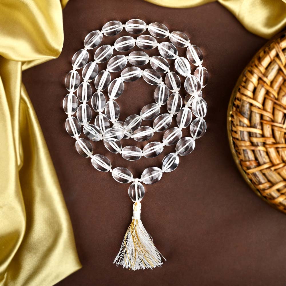 This mala is made with beautifully carved premium Sphatik (crystal quartz) beads in a unique starfruit shape, each bead reflecting light with a smooth and glossy finish. The flawless beads are strung together with care, featuring a simple yet elegant design, and completed with a white and golden tassel, symbolizing purity and spiritual energy. Sphatik is known for its purifying and healing properties. It is believed to enhance clarity, balance energy, and remove negative vibrations. This mala is perfect for meditation, mantra chanting, and spiritual practices, helping the wearer achieve mental peace, clarity of thought, and emotional stability. It also strengthens the connection to higher spiritual realms, promoting inner peace and harmony.