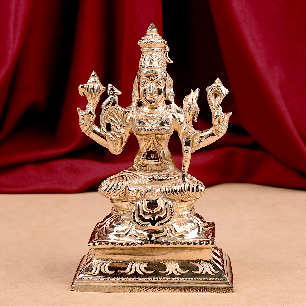 The Blissful Idol of Goddess Kamakshi seated on a beautiful pedestal with crescent moon on her forehead and her hands holding sugarcane bow, lotus, Pasa chakra and Angusa chakra is made from Panchadhatu. The Idol with sophisticated detailing has been crafted by artisans of South India and is ideal to place in your puja altar.Goddess Kamakshi one of the forms of Parvati and consort of Lord Shiva helps her devotees to attain liberation by helping them control their desires or emotions.