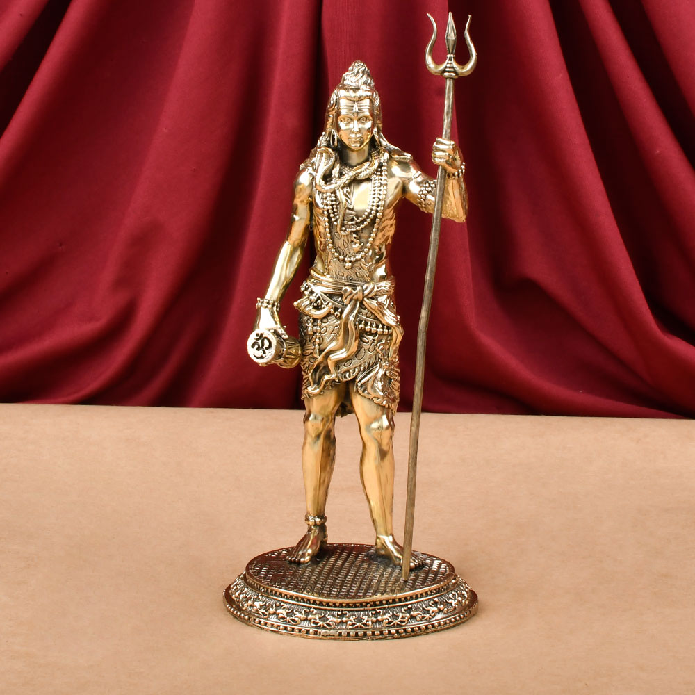 Crafted from Ashtadhatu, a sacred combination of eight metals—gold, silver, copper, lead, zinc, tin, iron, and mercury—with trace amounts of gold and silver, the idol has a brilliant antique-gold finish that enhances its divine appeal and intricate carvings. His calm yet commanding expression reflects the supreme yogi and destroyer of evil.