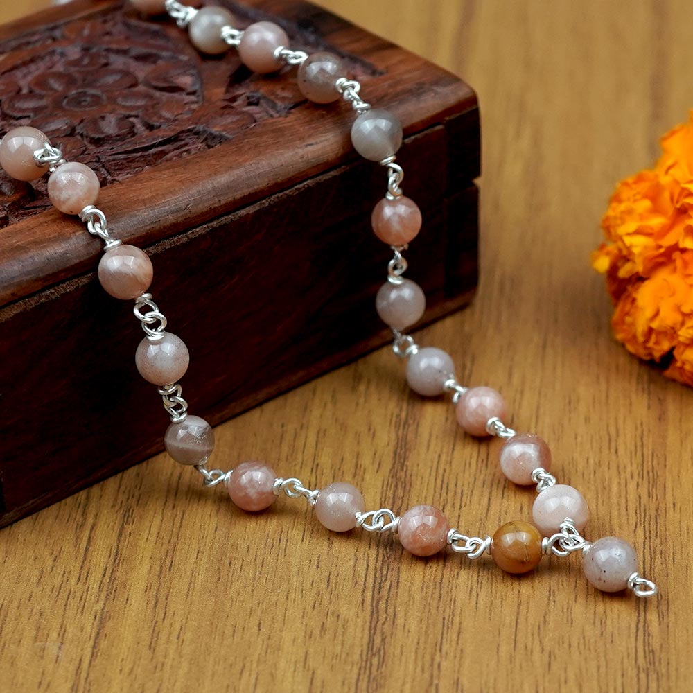 This Natural Sunstone Mala features round, polished beads elegantly linked with silver wire. A central Sumeru bead sits at the heart of the mala, enhancing its design and significance. Sunstone is a stone of vitality and confidence, resonating with the Solar Plexus Chakra. It enhances personal power, motivation, and emotional strength while dispelling negativity. Wearing this mala helps attract positivity, success, and a balanced state of mind. Benefits of Wearing Sunstone Mala Enhances confidence, motivation, and leadership qualities. Promotes emotional balance, positivity, and inner strength. Attracts prosperity, success, and opportunities. Energizes the Solar Plexus Chakra for mental clarity and vitality.