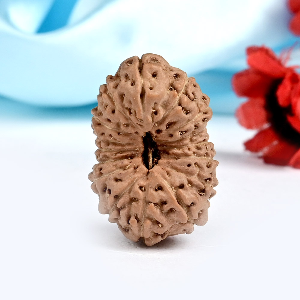 The 16 Mukhi Rudraksha embodies Mahamrityunjaya Shiva, who represents the eternal aspect of the self, transcending the cycles of life and death and symbolizing immortality and transcendence. The wearer is blessed with good health, protection, mental fortitude, and resilience, and is guided towards realizing their full potential. It eliminates fears, phobias, depression, and negative thinking, while aiding in resolving unlawful disputes and court cases in one’s favor. It also gives the wearer the strength to let go of what no longer serves the present moment, alleviating the burden of accumulated stress from clinging. According to the Katyayani Tantra, this divine Rudraksha safeguards against various diseases, including chronic and fatal ones. The Mahamrityunjaya mantra is recited during times of illness to protect against untimely death. The healing properties of this Rudraksha support curing low back pain, kidney, bladder, and large intestine ailments.