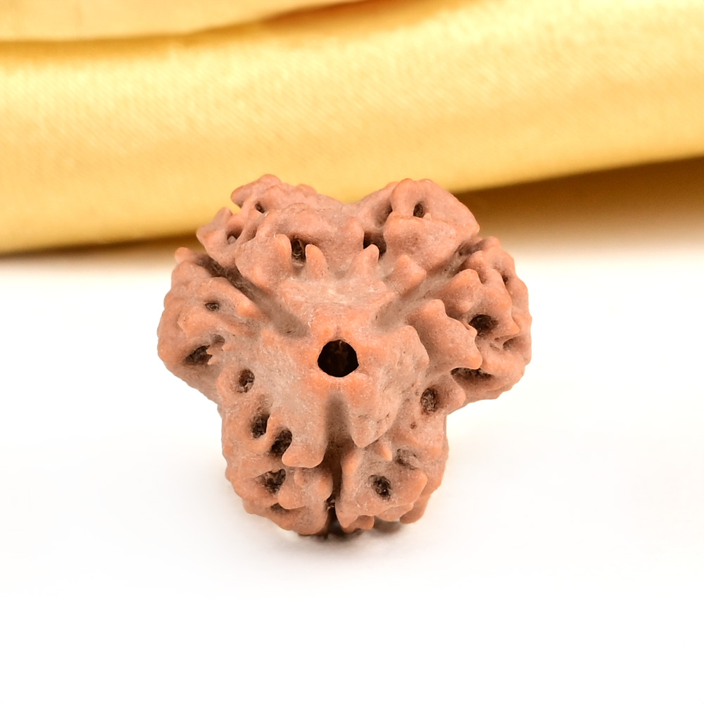 The 3 Mukhi Rudraksha represents Agni, the deity of fire. This Rudraksha has the ability to burn past karma, purify consciousness, and liberate individuals from the bondage of their past. This sets the stage for achieving success through virtuous actions in one's current existence. The 3 Mukhi Rudraksha has the power to purify one's past impressions of anger, hurt, shame, and stress, connecting them to their true and pure self, just like fire burns everything yet remains pure.