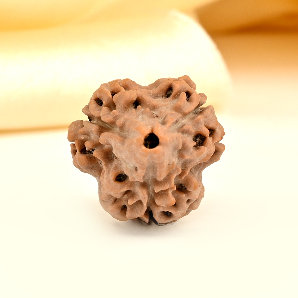 The 3 Mukhi Rudraksha represents Agni, the deity of fire. This Rudraksha has the ability to burn past karma, purify consciousness, and liberate individuals from the bondage of their past. This sets the stage for achieving success through virtuous actions in one's current existence. The 3 Mukhi Rudraksha has the power to purify one's past impressions of anger, hurt, shame, and stress, connecting them to their true and pure self, just like fire burns everything yet remains pure.