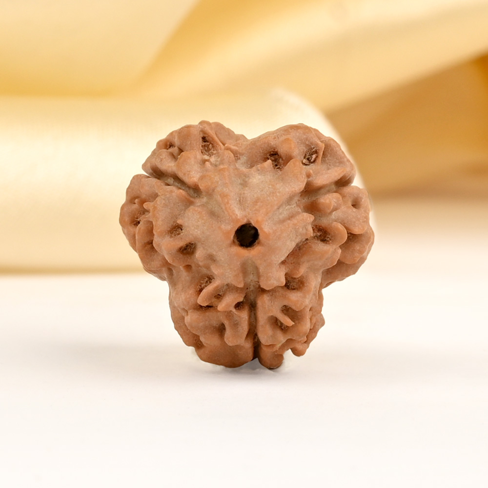 The 3 Mukhi Rudraksha represents Agni, the deity of fire. This Rudraksha has the ability to burn past karma, purify consciousness, and liberate individuals from the bondage of their past. This sets the stage for achieving success through virtuous actions in one's current existence. The 3 Mukhi Rudraksha has the power to purify one's past impressions of anger, hurt, shame, and stress, connecting them to their true and pure self, just like fire burns everything yet remains pure.