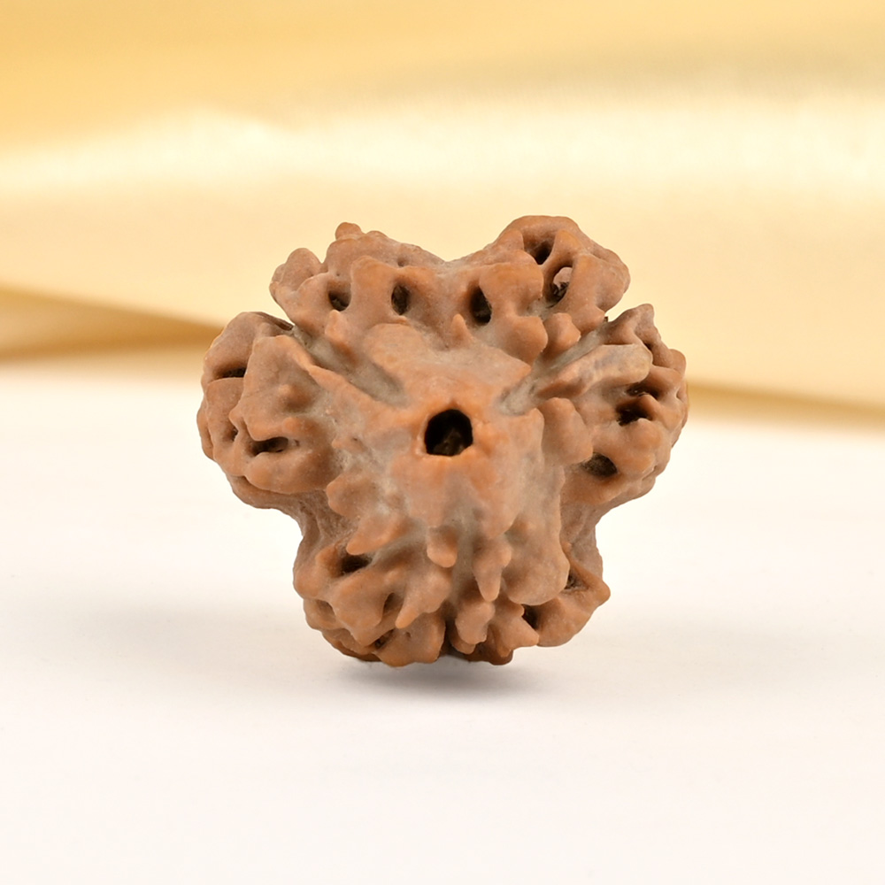 The 3 Mukhi Rudraksha represents Agni, the deity of fire. This Rudraksha has the ability to burn past karma, purify consciousness, and liberate individuals from the bondage of their past. This sets the stage for achieving success through virtuous actions in one's current existence. The 3 Mukhi Rudraksha has the power to purify one's past impressions of anger, hurt, shame, and stress, connecting them to their true and pure self, just like fire burns everything yet remains pure.