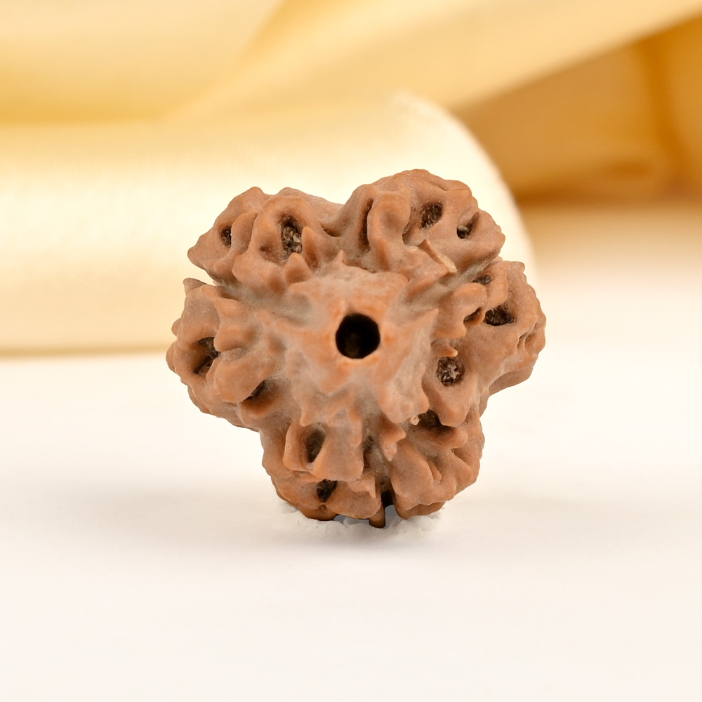 3 Mukhi is ruled by the planet Sun. It enhances the beneficial effects and removes the malefic influences of the Sun. A harmonious Sun in the natal chart empowers individuals to fully utilize their resources and pursue their life purpose with enthusiasm and determination. The Sun is a symbol of self-awareness and provides us with guidance and strength. Its high ranking on the chart gives individuals a vibrant and captivating presence. It promotes present moment awareness and empowers them to harness their inner strength instead of giving it away to others. This essence is bestowed upon the wearer of the 3 Mukhi Rudraksha.