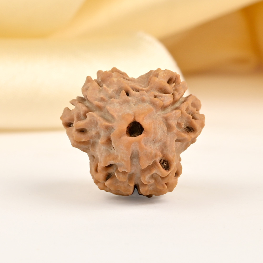 The 3 Mukhi Rudraksha represents Agni, the deity of fire. This Rudraksha has the ability to burn past karma, purify consciousness, and liberate individuals from the bondage of their past. This sets the stage for achieving success through virtuous actions in one's current existence. The 3 Mukhi Rudraksha has the power to purify one's past impressions of anger, hurt, shame, and stress, connecting them to their true and pure self, just like fire burns everything yet remains pure.