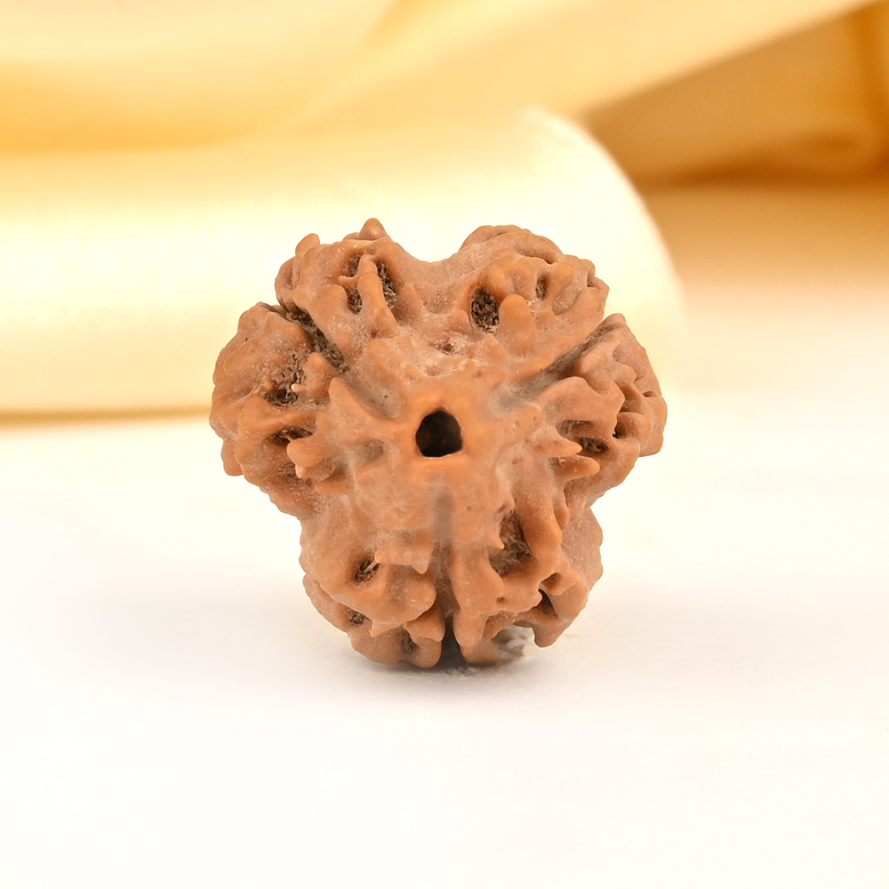 The 3 Mukhi Rudraksha represents Agni, the deity of fire. This Rudraksha has the ability to burn past karma, purify consciousness, and liberate individuals from the bondage of their past. This sets the stage for achieving success through virtuous actions in one's current existence. The 3 Mukhi Rudraksha has the power to purify one's past impressions of anger, hurt, shame, and stress, connecting them to their true and pure self, just like fire burns everything yet remains pure.