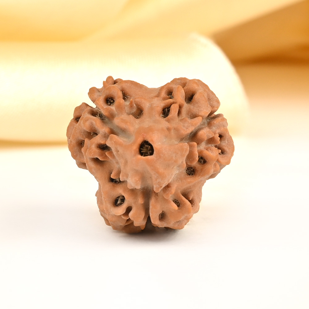 The 3 Mukhi Rudraksha represents Agni, the deity of fire. This Rudraksha has the ability to burn past karma, purify consciousness, and liberate individuals from the bondage of their past. This sets the stage for achieving success through virtuous actions in one's current existence. The 3 Mukhi Rudraksha has the power to purify one's past impressions of anger, hurt, shame, and stress, connecting them to their true and pure self, just like fire burns everything yet remains pure.