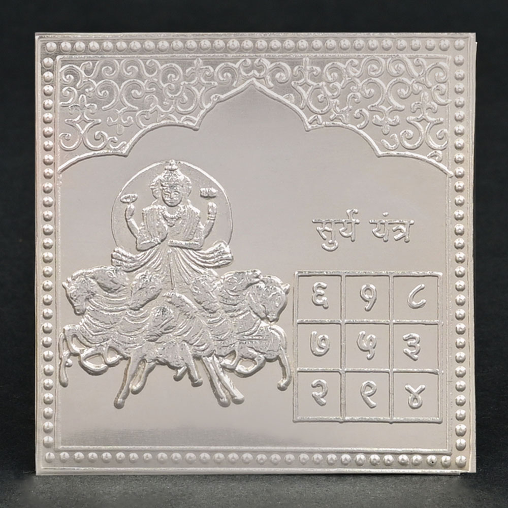Surya Yantra and His image neatly embossed on a pure silver sheet are dedicated to the powerful planet Sun. The Yantra Surya governs over will-power, energy, bravery, leadership, authority, administration, fame and power. This Yantra helps pacify the malefic of planet Sun and attracts its divine grace. You may frame the Yantra and place in puja altar or carry it in your wallet or purse.