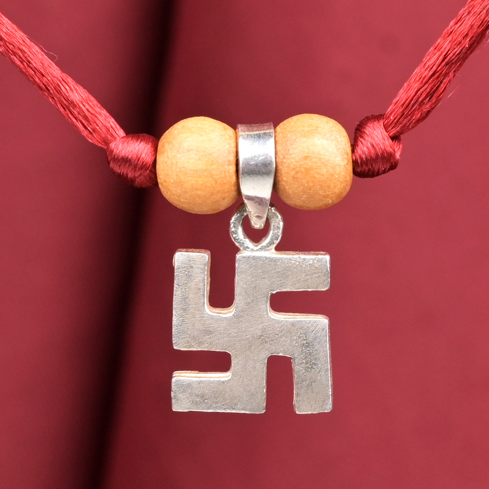 A simple yet beautiful Swastik locket in pure silver. It is set in adjustable silk thread. Swastik is used as luck charm. ‘su’- meaning good, well, ‘ asti’ means it is, making it ‘Svasti’ which means good health or good prosperity. And when ‘ka’ as a suffix is added, it means that which is connected with well-being’. It is also a symbol of the Sun. One who wishes to stay in positivity should wear this elegant piece of mysticism.