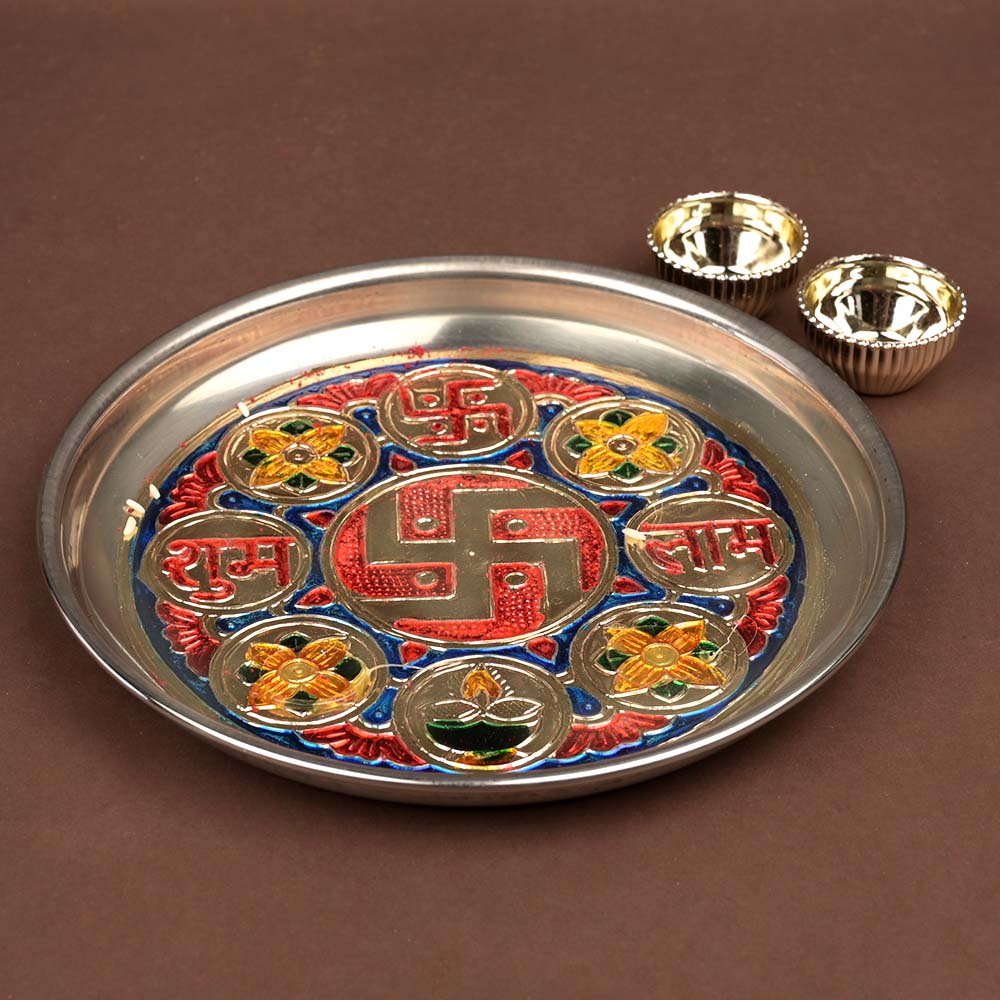 Auspicious Designer Puja Thali with Haldi Kumkum Containers is made in steel and comes with traditional Meenakari work. The plate featuring the auspicious ‘Swastik’ design in centre has neat floral designs in vibrant and gold. This plate is ideal to use during festivals, Homa, puja rituals or religious ceremonies. Accompanied with two small containers to hold Haldi and Kumkum, the plate is very easy to maintain.