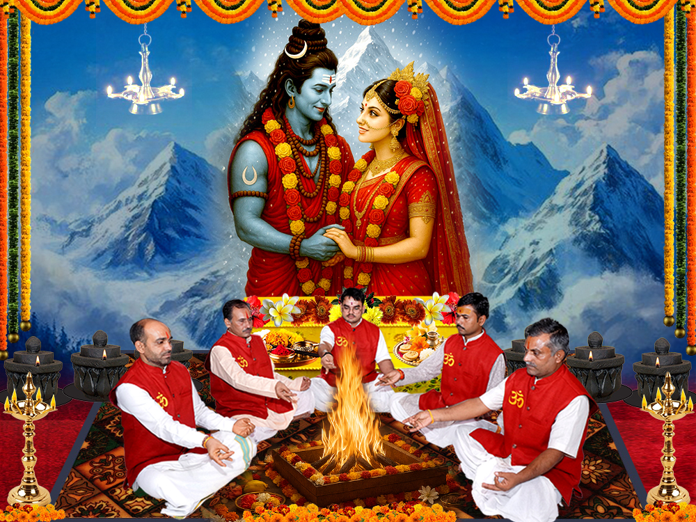 Puja Service Includes: Kalash Sthapana, Panchang Sthapana (Gauri Ganesh, Punyavachan, Shodash Matrika, Navgraha, Sarvotabhadra), 64 yogini Pujan, Shetrapal Pujan, Swasti Vachan, Sankalpa, Ganesh & Laxmi Pujan, Invocation of major Gods and Goddesses in Kalash, Shiva Parvati Abhishek and Pujan, Swayamvara Parvati Moola Mantra Japa, recitation of Shiva Parvati Strotra and Soundarya Lahari verses, Homa, Aarti and Pushpaanjali.