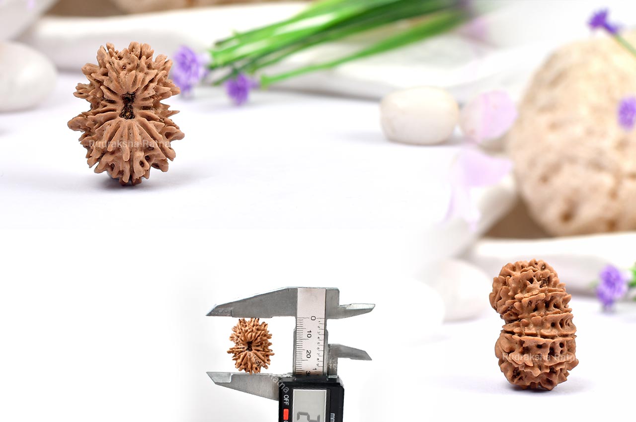 The 13 Mukhi Rudraksha embodies Kamadeva, the God of Love. It bestows a hypnotic attraction upon the wearer and aids in manifesting materialistic desires. Kamadeva, blessed by Lord Shiva, blurs the lines between illusions and reality, aligning a person with the right intent for their actions and thus aiding fulfillment. It enhances one’s sexuality and brings joy and zest to life, particularly for those who seek to make the most of the material world. Siddhas wear this Rudraksha to rise above Maya or illusions and thereby awaken Siddhis and raise Kundalini energy.