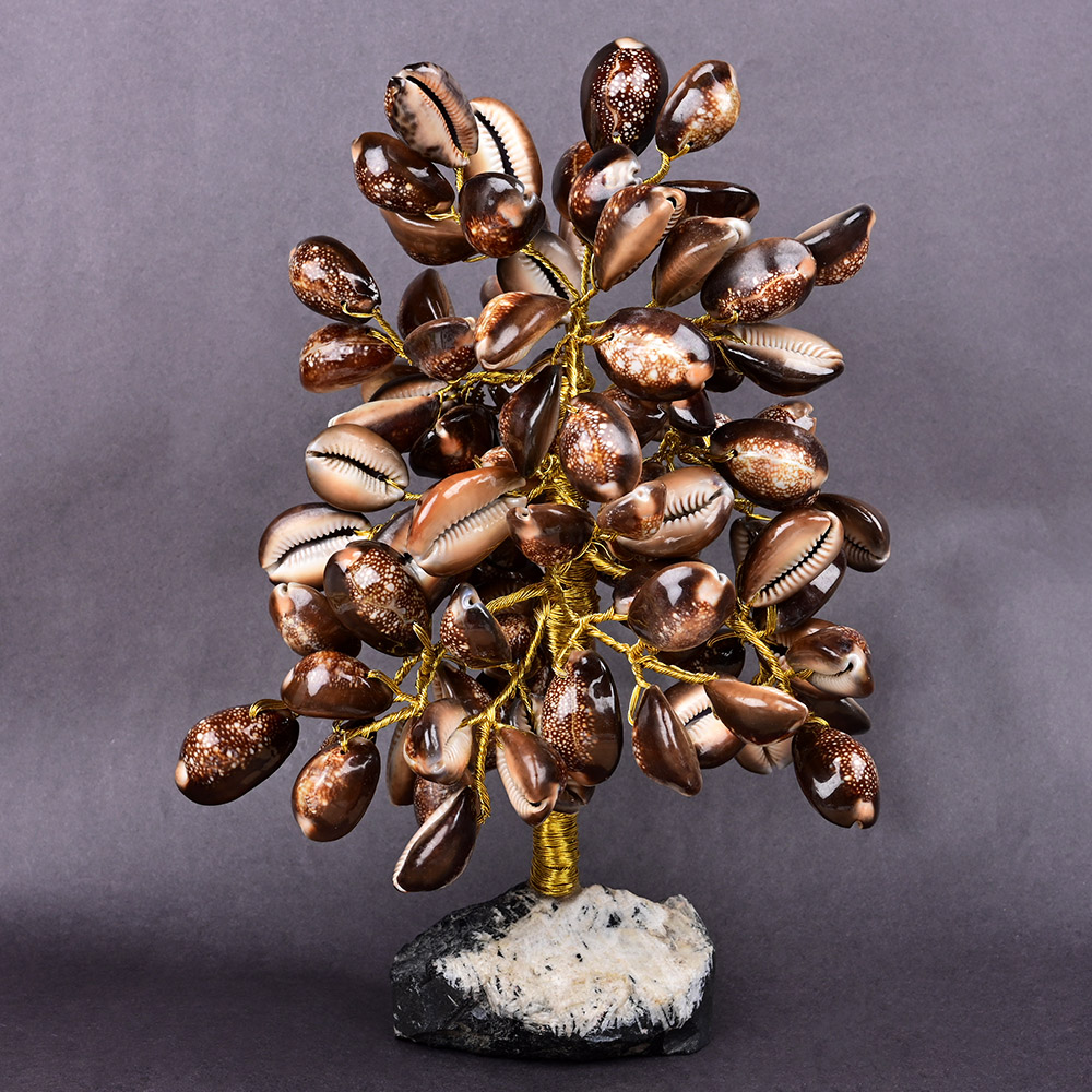 This handcrafted tree features natural Tiger Cowry shells as leaves on golden wire branches, set on a solid Black Tourmaline base. The glossy patterned shells, twisted golden wire, and matte crystal stone create a rich contrast of textures, making it an elegant décor piece as well as a meaningful, symbolic gift.