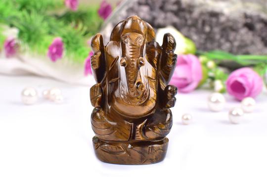 This sleek Lord Ganesh Idol in silky luster is artistically carved in 100% Natural Tiger Eye gemstone. The mesmerizing eloquent Yellowish brown sheen of idol beautifully reminds of Kapila Ganesh- the Lord, Who is yellowish-brown coloured. In this Idol, He is sitting and holding weapons in His upper hands, while His left palm holds a modak and His lower right hand is in a blessing position. Lord Ganesha in Tiger eye brings luck, willpower, happiness, success and balance along with removing of obstacles and blessings of wisdom and intelligence. This idol makes an excellent idol for those planning to start new business ventures and for those looking for change in career. Place the powerful idol in your puja altar, work or study desk for divine blessings.