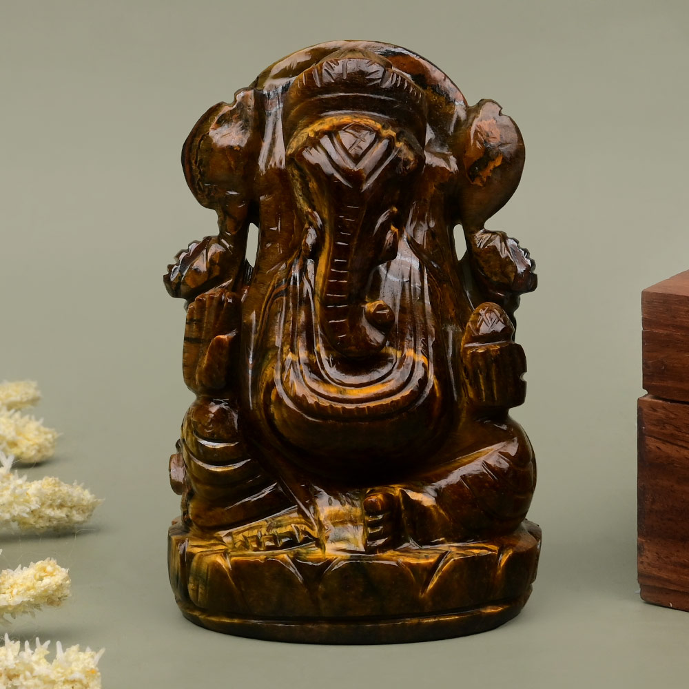 In this Idol, He is carved as sitting on lotus in Tigers eye stone for courage, strength, will and personal power. It is very sensual, grounding and insightful and is considered a good luck stone.