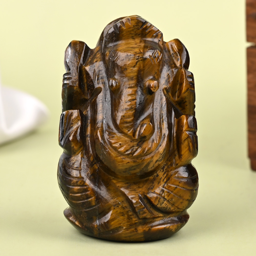 This sleek Lord Ganesh Idol in silky luster is artistically carved in 100% Natural Tiger Eye gemstone. The mesmerizing eloquent Yellowish brown sheen of idol beautifully reminds of Kapila Ganesh- the Lord, Who is yellowish-brown coloured. In this Idol, He is sitting and holding weapons in His upper hands, while His left palm holds a modak and His lower right hand is in a blessing position. Lord Ganesha in Tiger eye brings luck, willpower, happiness, success and balance along with removing of obstacles and blessings of wisdom and intelligence. This idol makes an excellent idol for those planning to start new business ventures and for those looking for change in career. Place the powerful idol in your puja altar, work or study desk for divine blessings.