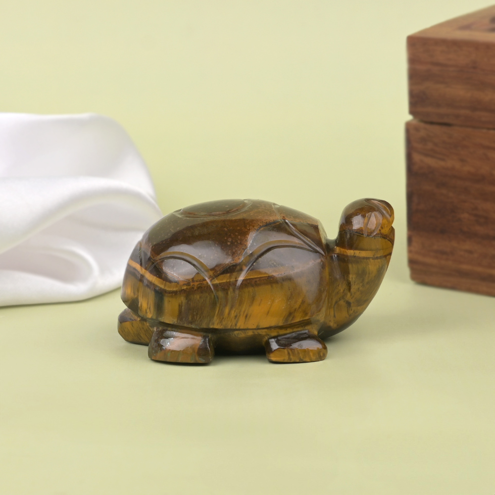 Carved in natural Tiger Eye Gemstone, the Tiger Eye Kurma looks lifelike, with skilful craftsmanship. Tiger Eye Gemstone provides courage, strength, helps to dispel fear, grounds energies, fortifies will power, protects and is considered a good luck stone.