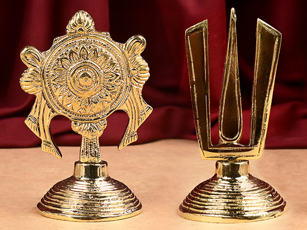 Tirupati Balaji Shanku Chakra Naama Set is made in heavy shinny brass. This auspicious set is to be kept on the Puja Altar, home or office and can be gifted to your near and dear ones on special occasion. This has symbols that are highly revered by Lord Vishnu devotees as they represent Lord Venkateswara or Lord Balaji. The symbols are Sudarsha Chakra, Tilak and Shankh.