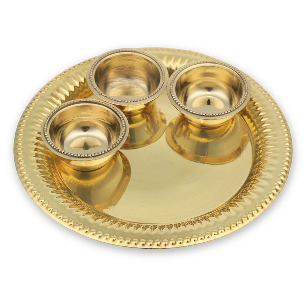 A gleaming tray in golden brass holds three beautiful bowls in which you can keep anointing powders such as haldi (Turmeric), kumkum (Vermilion), chandan (Sandalwood), rice grains or sweet offerings for your favorite gods and goddesses.
