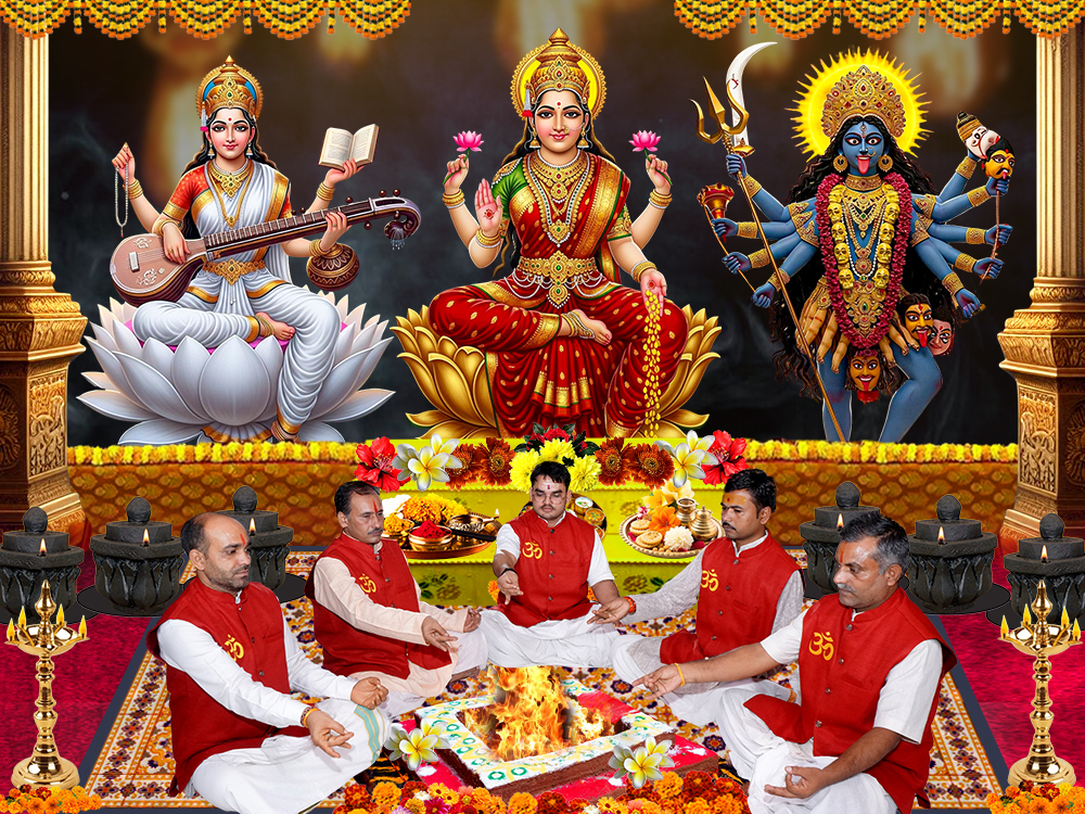 Puja Services Include: Kalash Sthapana, Panchang Sthapana(Gauri Ganesh, Punyavachan, Shodash Matrika, Navgraha, Sarvotabhadra), 64 yogini Pujan, Shetrapal Pujan, Swasti Vachan, Sankalpa, Ganesh Pujan and Abhishek, Navgraha Pujan, Invocation of major Gods and Goddesses in Kalash, Laxmi, Saraswati, Kali Sthapana and Puja, Laxmi, Saraswati, Kali Yantra Pujan and abhishek, Laxmi Suktam recitation 11 times, Kali Stotram 11 times, Saraswati Stotram 11 times, Tridevi mantra japa 11,000 times, Aarti and Pushpaanjali.