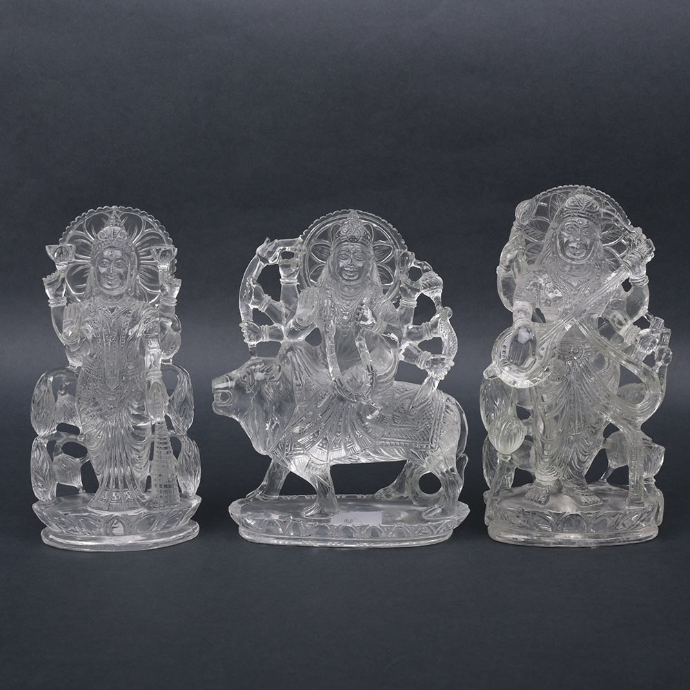 This set comprises of fine hand-crafted Laxmi, Saraswati & Durga idols made from Sphatik (natural crystal quartz). The Sphatik used is of flawless variety and the features of each idol are intricately carved and they are shown with their respective weapons and instruments. Crystal Quartz or Sphatik is one of the most powerful gemstones energetically as it holds onto the positive vibration of mantra chanting. The deity idols are more preferred in this gemstone. It harmonizes the aura around us and removes the negative energy.