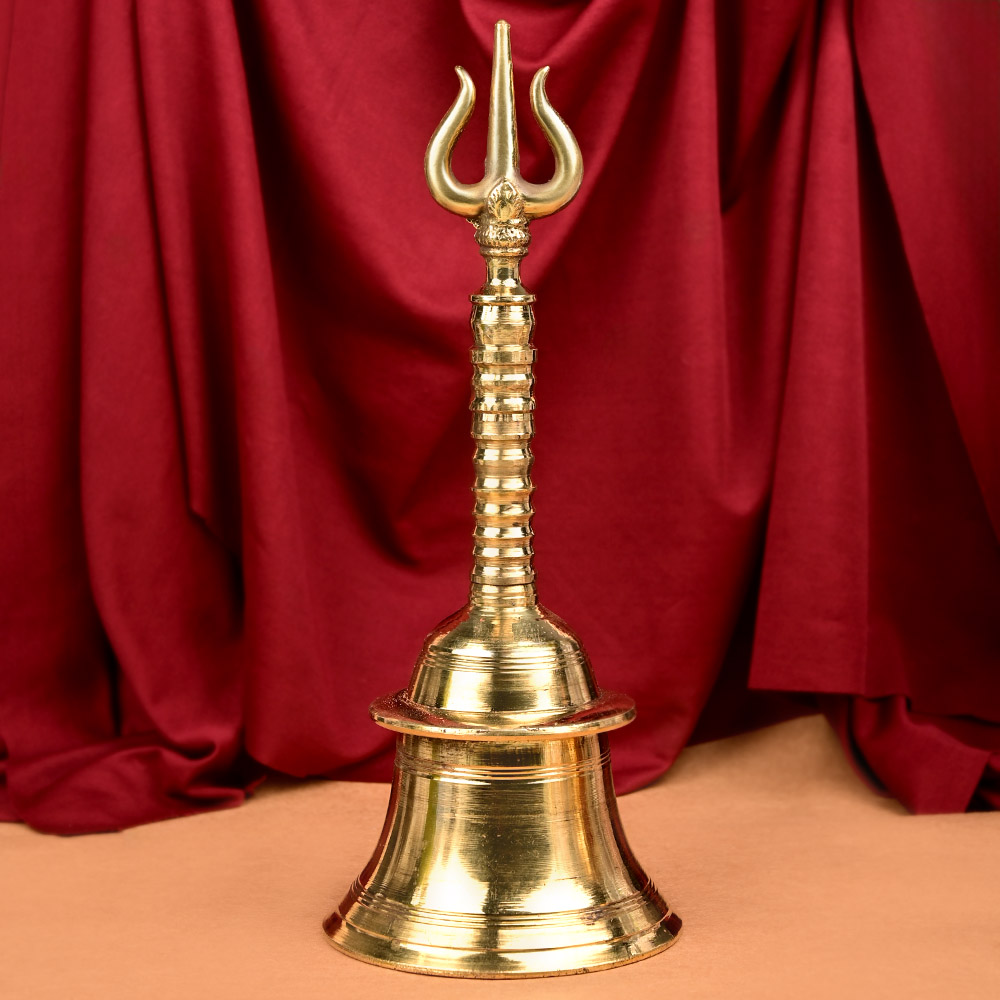 This beautifully designed bells featuring a Trident atop the handle is crafted from heavy-duty superior quality brass. This neatly designed bell with fine polish finish is surely a great pick for your puja altar due to its shining finish. With sleek handle and smoothened ends of trident ensure comfort of usage during puja rituals. Trident is an auspicious symbol which is symbolic of threefold qualities of nature which is creation, preservation and destruction and is believed to dispel sufferings. Ringing of bell is believed to create spiritual vibrations while offering a cheerful tone to the singing or chanting of hymns or Aarti. Its sound helps bring the ever-wandering mind under control and help it focus better on the Deity.