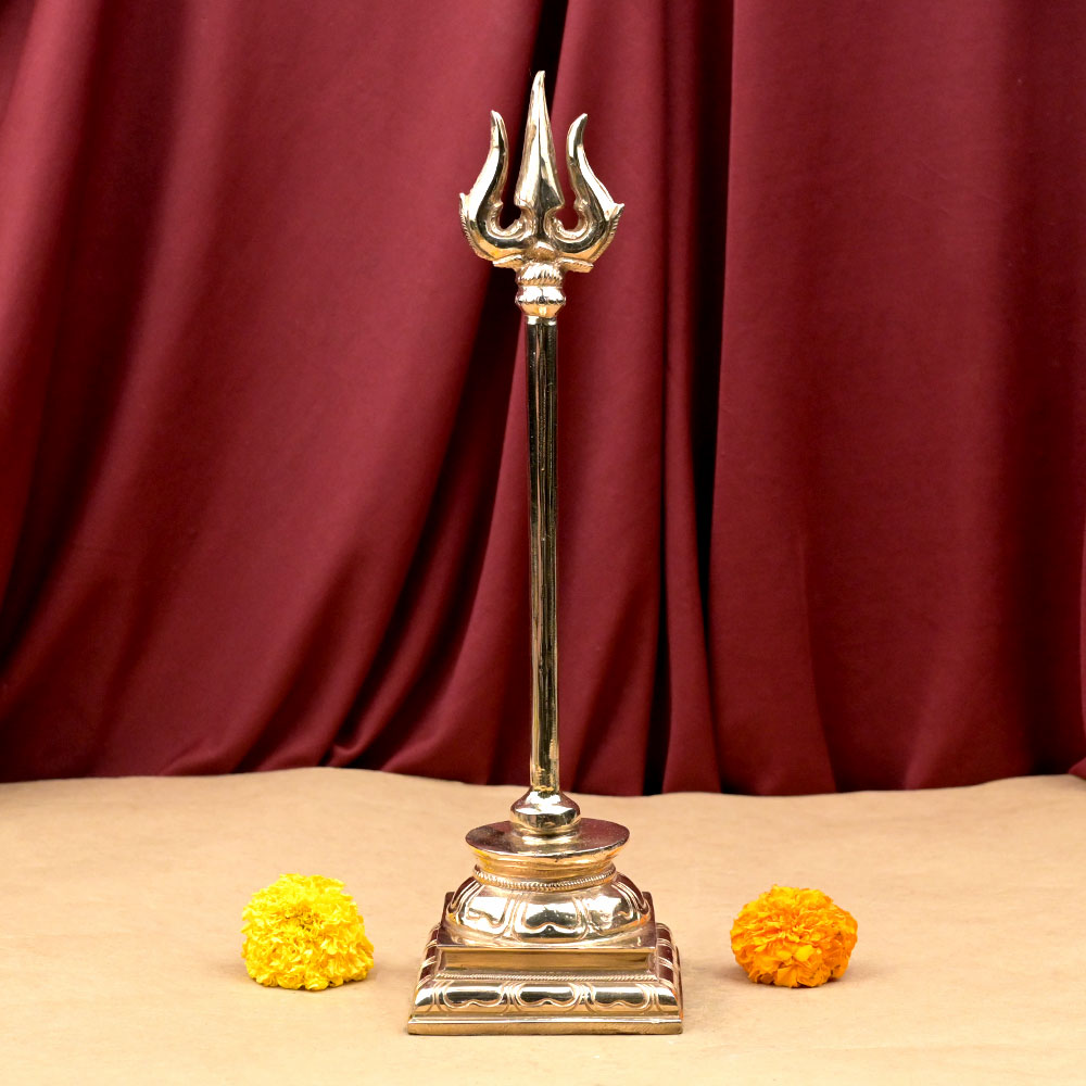 Immerse yourself in the divine aura with our exquisite bronze Trident, the sacred weapon of Bhagawan Shiva. This sculpture beautifully captures Bhagawan Shiva's trident, symbolizing creation, sustenance and regeneration. The exquisite craftsmanship and intricate detailing of the bronze cast emphasize the sacred essence of this divine weapon, creating a meaningful and captivating addition to your home or altar.