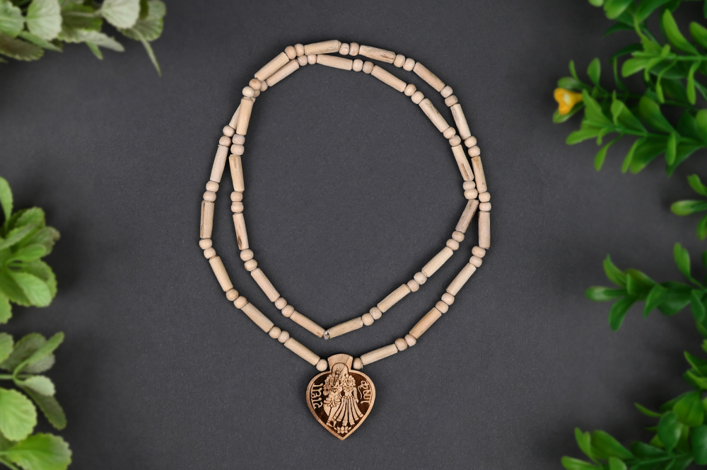 Design: Made of round, cylindrical shaped tulsi beads with Radha krishna pendent with clasp