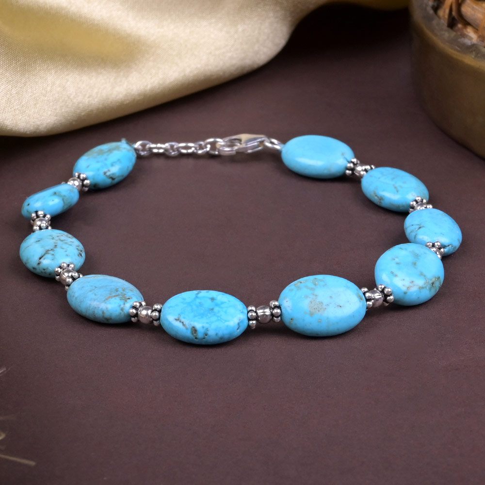 This elegant bracelet features finely polished flat oval Turquoise (Firoza) stones, each uniquely marked with natural matrix patterns that enhance its earthy charm. The serene sky-blue gems are artistically interspaced with silver spacers, creating a harmonious flow of color and texture. Crafted with precision, the bracelet is strung on a secure chain fitted with a 925 silver lobster clasp and extender links, allowing for an adjustable fit. The design is minimal yet striking, allowing the vibrant Turquoise to remain the focal point. Turquoise, known as Firoza in ancient texts, is a sacred gemstone associated with divine protection and spiritual grounding. It has long been revered by saints and seers as a stone that absorbs negativity and uplifts the soul into higher states of truth and wisdom. Wearing this bracelet is believed to bring peace of mind, enhance communication, and attract auspiciousness in both personal and professional life. It balances the Throat Chakra, empowering the wearer to express their truth fearlessly while staying rooted in compassion and clarity.