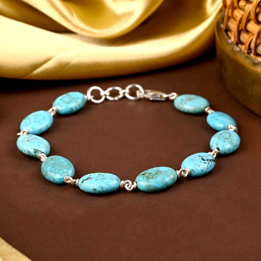 This bracelet is crafted with natural turquoise flat oval beads, each stone showcasing unique blue tones with natural earthy veins. The beads are neatly linked together with 925 sterling silver wire, giving the bracelet strength and an elegant finish. It is secured with a durable silver clasp, making it easy and comfortable to wear daily. Turquoise (Firoza) is revered as a gemstone of protection, healing, and prosperity. It promotes clear communication, emotional balance, and shields the wearer from negative energies. When combined with sterling silver, its spiritual vibrations are further enhanced, making this bracelet an ideal choice for harmony, confidence, and inner peace.