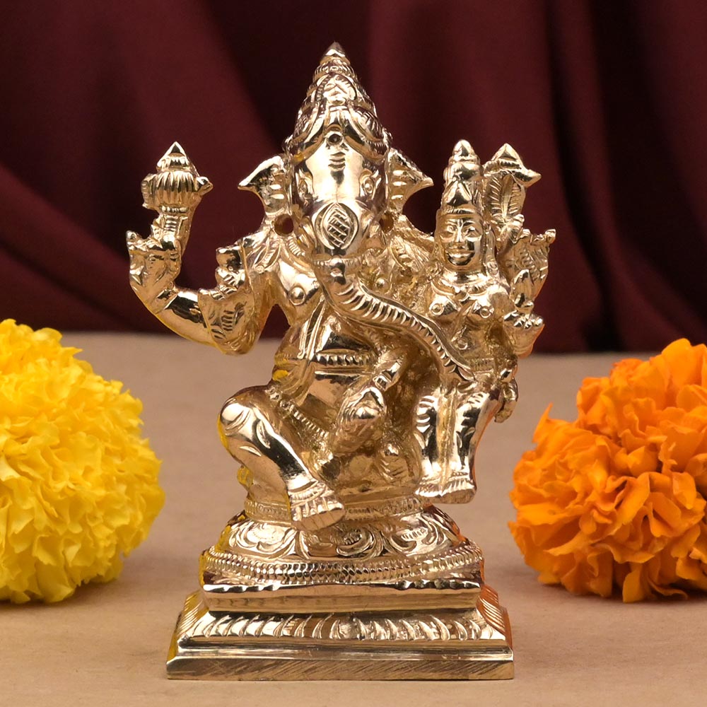 The bronze idol depicted here is of Uchishta Ganapathi, a unique and powerful form of Lord Ganesha. This intricately crafted idol features Ganesha sitting in a distinct posture with one of his consorts by his side, symbolizing the unity of divine wisdom and feminine energy. The sculpture showcases Ganesha holding various objects, each with significant symbolism—such as the conch shell, representing auspiciousness and the primordial sound of creation, and a lotus, symbolizing spiritual purity and growth. The craftsmanship highlights fine details such as Ganesha's gentle facial expression, his ornamental headdress, and his trunk's dynamic form, which conveys both grace and energy. The intricate jewelry and attire of both Ganesha and his consort demonstrate the artisan's skill, giving the idol an aura of divinity and splendor.