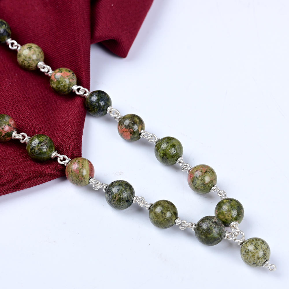 This Unakite Mala features round polished beads in natural green and soft pink tones. Each bead shows unique variations in color and pattern, highlighting the natural character of unakite stone. The beads are individually linked with 925 silver wire, creating a flexible and durable design. The silver detailing complements the earthy shades of the beads and gives the mala a balanced finish.