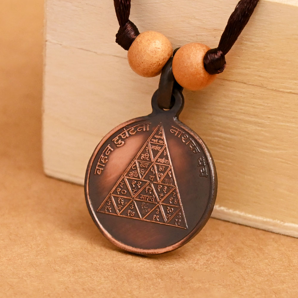 This antique finish locket made in copper has Vaahan durghatna nashak Yantra embossed in one side and Lord Hanuman image on other side. The Yantra is hung inside the vehicle or worn while driving or travelling for protection from accidents. The dedicated mantra is chanted 11 times at the inception of the travel.