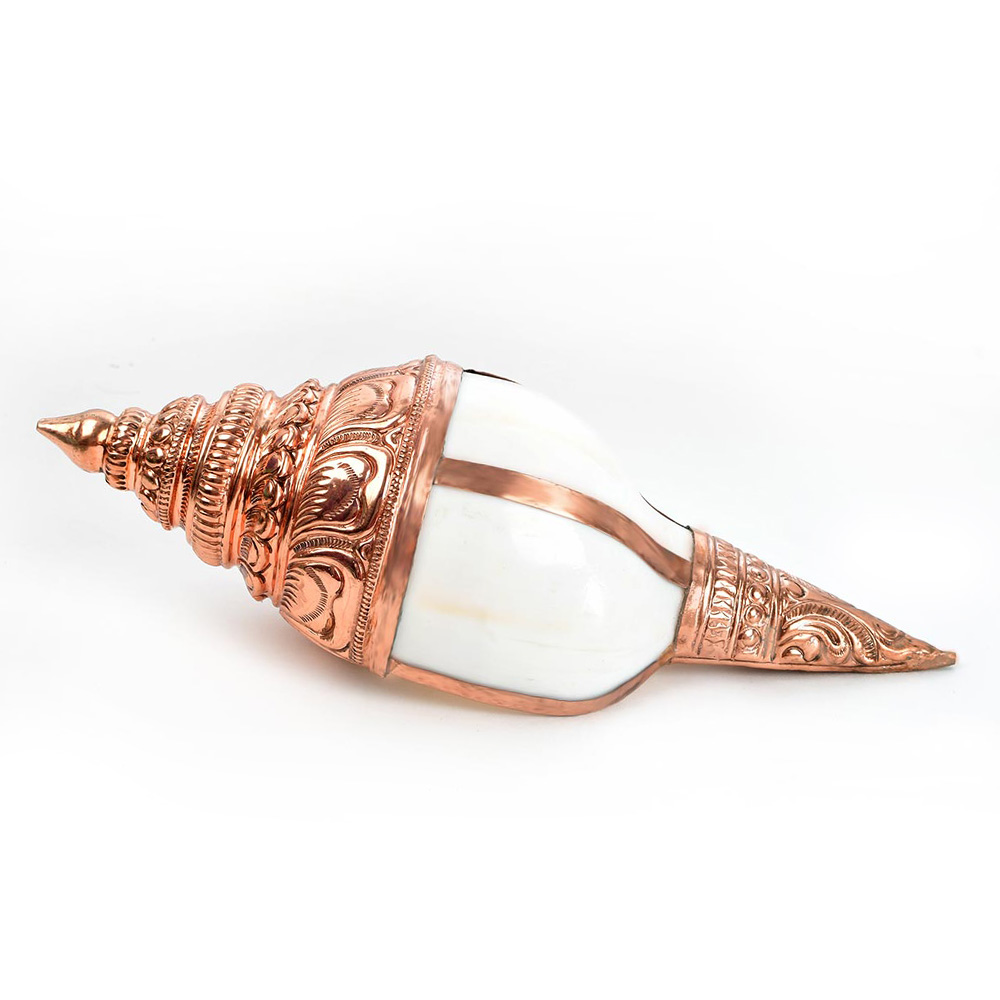 A beautiful white long tail shankh is covered in a decorative handcrafted copper casing that covers its top like a crown and descends neatly and holds it closely, following its shape. The lower portion of the Shankh cover is in conical shape, following its long tail and hand crafted with lovely designs on the top side and a different spiral design on the reverse side. It is ideal to be kept in the house for auspicious vibrations and used in puja for holding water and for abhishekam rituals. Long tail left handed shankh is rare and has a slim look and thick shell body and is found in deep water sea between 200-250 metres depth near South India.