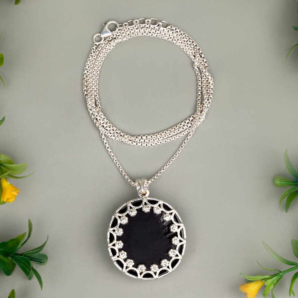 This circular pendant features a sacred Shaligram stone, naturally forming the divine Vishnu Laxmi Chakra. The deep black Shaligram from Gandaki river in Nepal is gracefully encased in a 925-sterling silver frame with an ornate floral lattice border, giving it an auspicious mandala-like appearance. Each petal-like segment of the design emanates a harmonious balance, echoing the chakra energies of Bhagwan Vishnu and Devi Lakshmi. The pendant is strung on a multi-strand silver chain with a secure lobster clasp, ideal for daily spiritual wear.