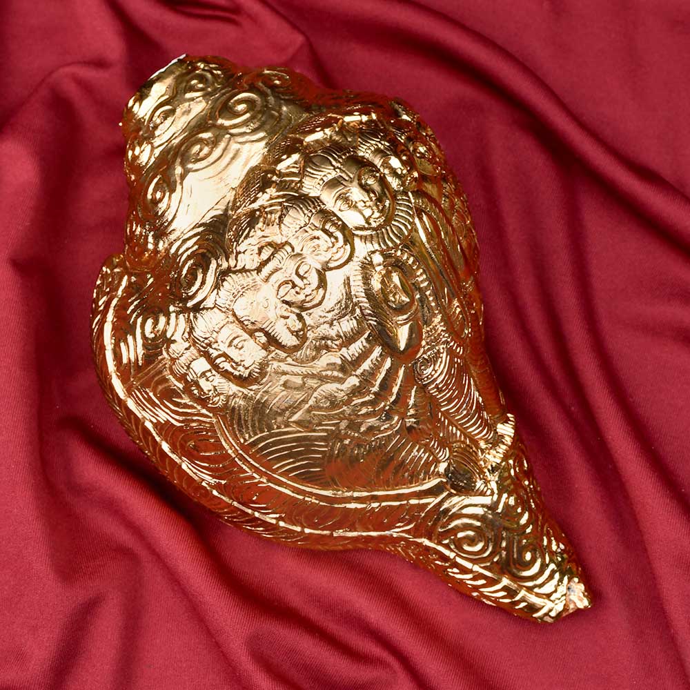 This rare Natural Left Hand Conch (Dakshinavarti Shankh) is exquisitely carved with the divine form of Lord Vishnu in Vishwarupam (Universal Form)—a cosmic vision that reveals the infinite expressions of the Divine. Intricately detailed and finished with elegant gold plating, this sacred conch is not just a collectible artifact, but a potent spiritual symbol of protection, dharma, and divine presence.