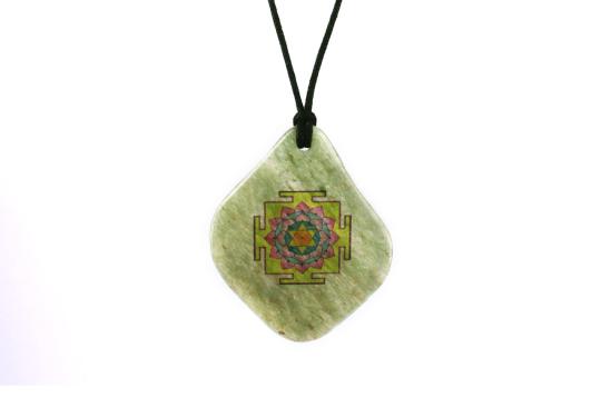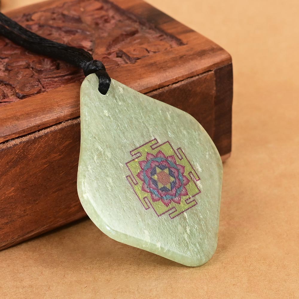 Stylish Pendant with Sacred Vishnu Yantra printed on Natural Green Jade gemstone. The sleek pendant with smooth finish and washable print would make a beautiful spiritual accessory. Green Jade and Vishnu Yantra together provide wealth, success, prosperity, bliss and fame. It also provides compassion, faith, understanding and good health.