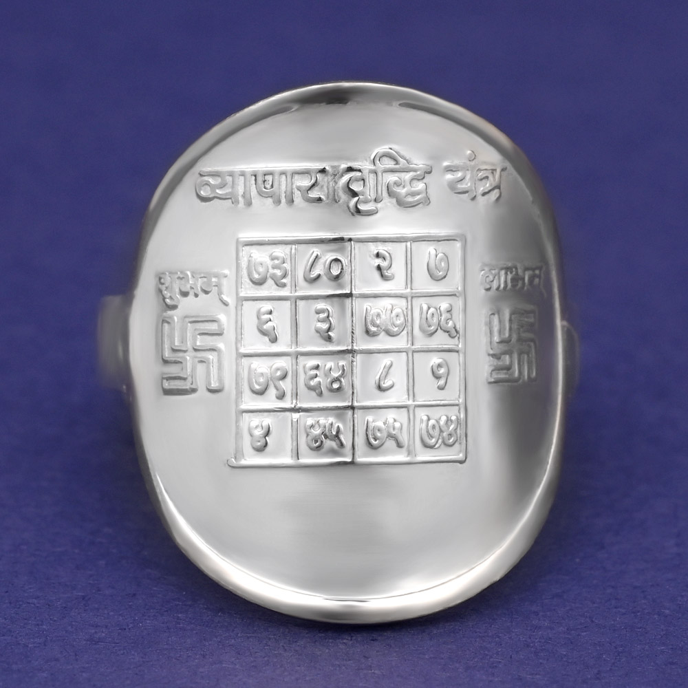 The Glowing Vyapar Vriddhi Yantra Ring in Silver is designed to unlock the door to prosperity. This exquisite ring, expertly crafted in sterling silver, serves as a powerful talisman to attract abundance and success. This Yantra ring has the Vyapar Vriddhi Yantra on top and an image of Lakshmi Devi and Shri Ganesh on the inside. The Vyapar Vriddhi Yantra enhances good luck, removes obstacles, and fosters business and financial growth.