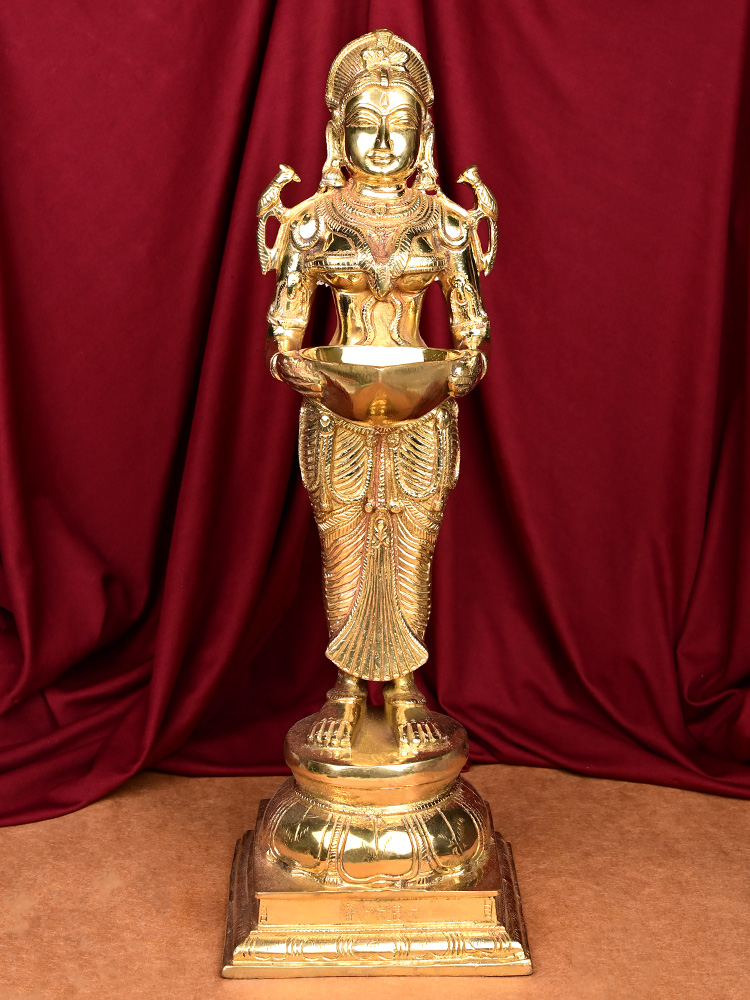 Welcome your guests with gorgeously crafted brass statue of woman holding lamp. With intricate craftsmanship and elegant design, the lamp would grace up your dwelling during puja or festivals. Place it near entrance or in center room to brighten up your dwelling. Lighting of oil lamp helps dispel dullness and negativity and creates a positive surrounding.