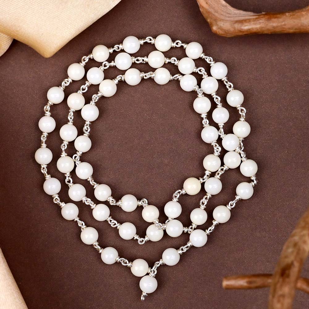 This mala is made from genuine white coral beads, each carefully hand linked with pure 925 silver wire for strength, flexibility, and refined craftsmanship. The beads are smooth, round, and uniform in size, offering a clean and balanced appearance. The silver wire not only adds durability but also allows the mala to move freely during japa, making it suitable for daily spiritual practice or calm, intentional wear. Every link is made with attention to detail, creating a mala that is both practical and spiritually aligned.