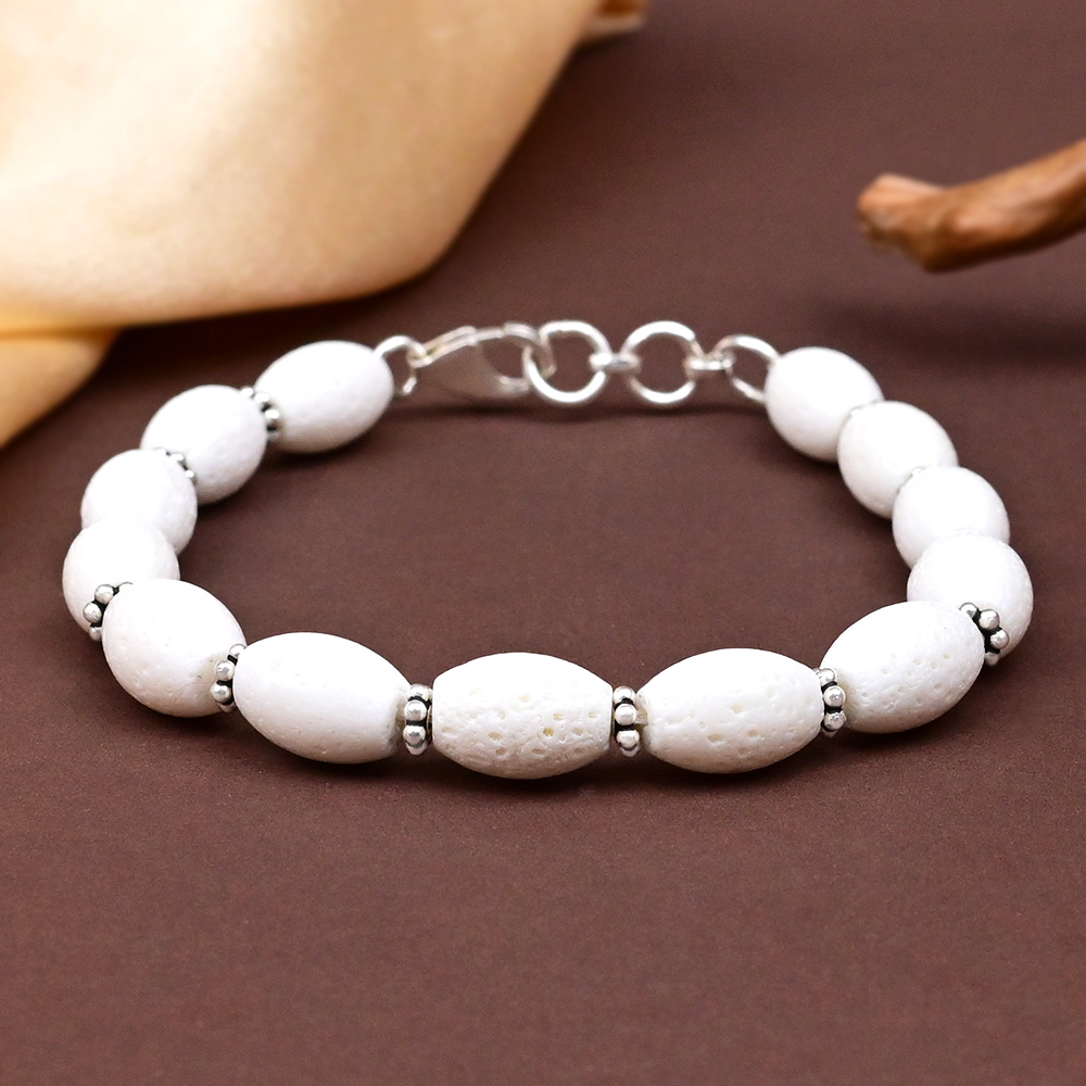 The White Coral Drum Shape Beads 925 Silver Chakri Bracelet is designed with smooth, elongated coral beads in a natural white tone. Each bead is separated by small sterling silver spacers (chakris), giving the bracelet a structured and balanced look. The bracelet is secured with a 925 sterling silver clasp, ensuring durability and ease of wear. The combination of organic coral beads and silver detailing creates a refined piece that is simple yet distinctive in design. White Coral is an organic gemstone found in the depths of the Mediterranean Sea and along the coasts of Japan and Italy. It is linked with the planet Venus in Vedic astrology and is considered a stone of peace, harmony, and emotional stability. Spiritually, White Coral is believed to attract positive energy, support harmonious relationships, and promote mental clarity. It is also said to strengthen immunity and enhance overall vitality. The addition of sterling silver not only complements the design but is also associated with lunar energies, further amplifying calmness and balance for the wearer.