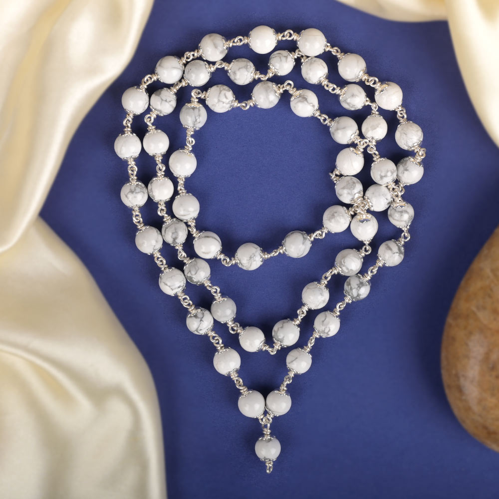 This exquisite White Howlite Mala is adorned with 925 sterling silver flower caps and silver wire links, giving it a graceful and timeless appeal. The smooth Howlite beads exude a serene white glow that radiates calmness and purity, while the silver accents enhance its elegance and sophistication.