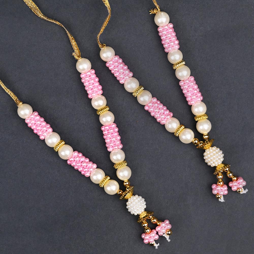 This set of two deity garlands is designed with alternating segments of cylindrical pink pearl bunches and large round white pearl-like beads, separated by golden rings for added shine. The garlands are finished with white beaded ends and three hanging pink pearl clusters, strung on a golden ribbon for easy placement.