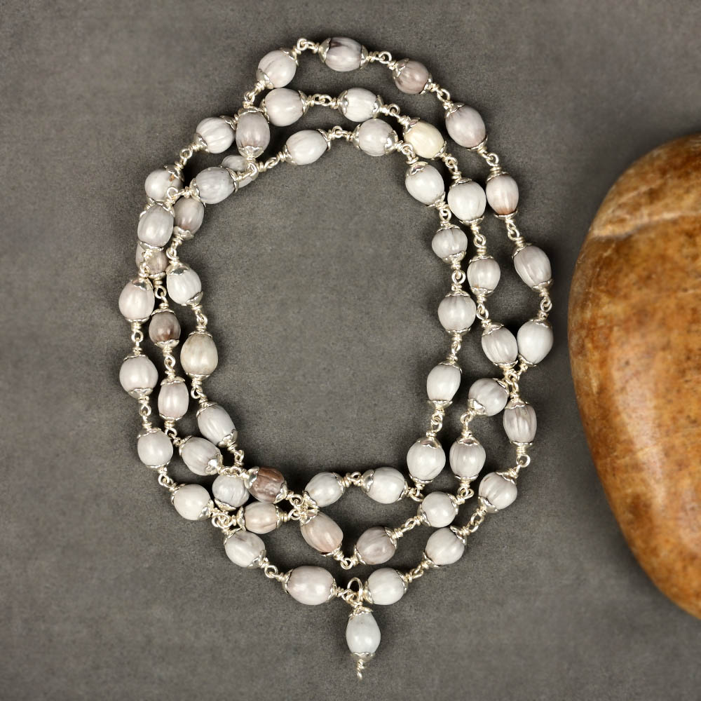 This exquisite mala is crafted from premium White Vaijayanti beads, elegantly strung in pure silver. Each bead is adorned with a 925 sterling silver flower cap and linked with silver chainwork, enhancing its divine beauty.