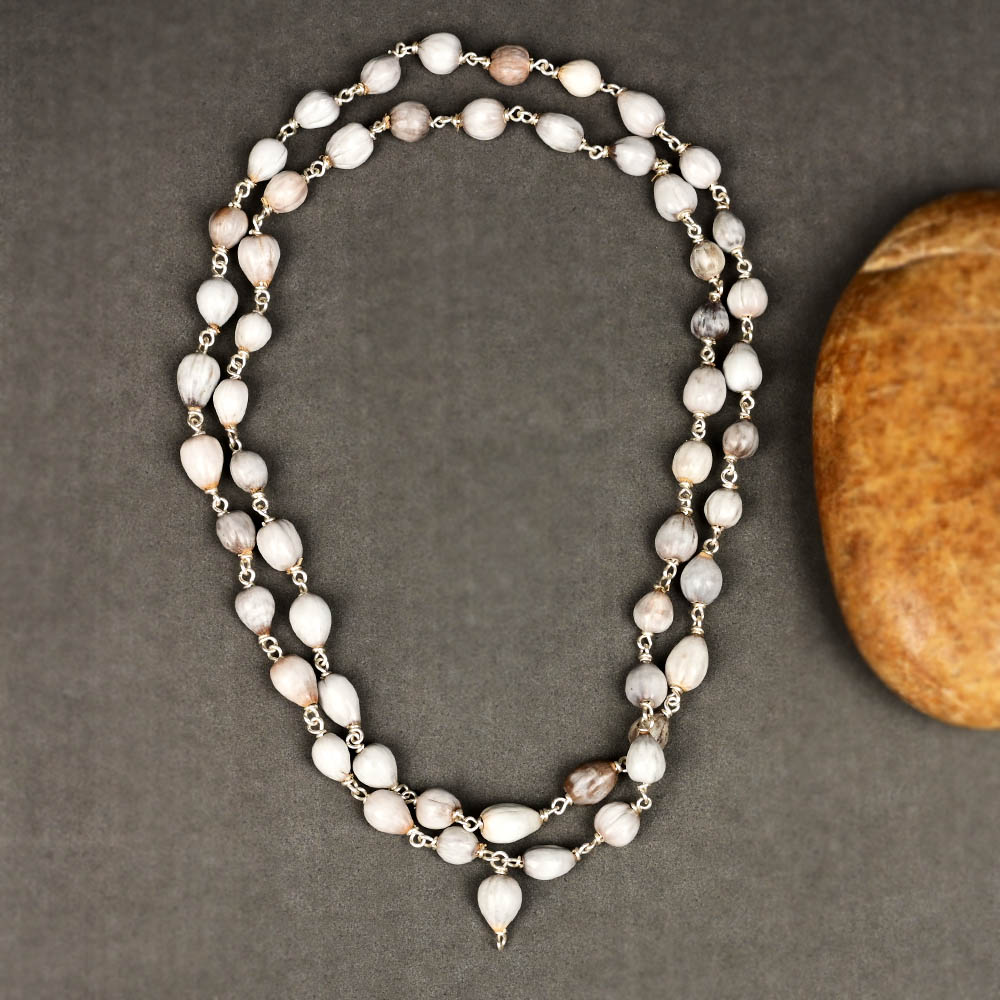This mala features pristine white Vaijayanti beads, carefully strung together with high-quality 925 sterling silver wire. The White Vaijayanti Mala is deeply connected to Lord Vishnu and symbolizes victory, divine grace, and protection. It is considered sacred in Hinduism and is widely used in devotional practices, especially prayers to Lord Vishnu, Krishna, and Ram. The presence of silver further amplifies its spiritual potency, making it an ideal tool for mantra recitation, meditation, and japa.